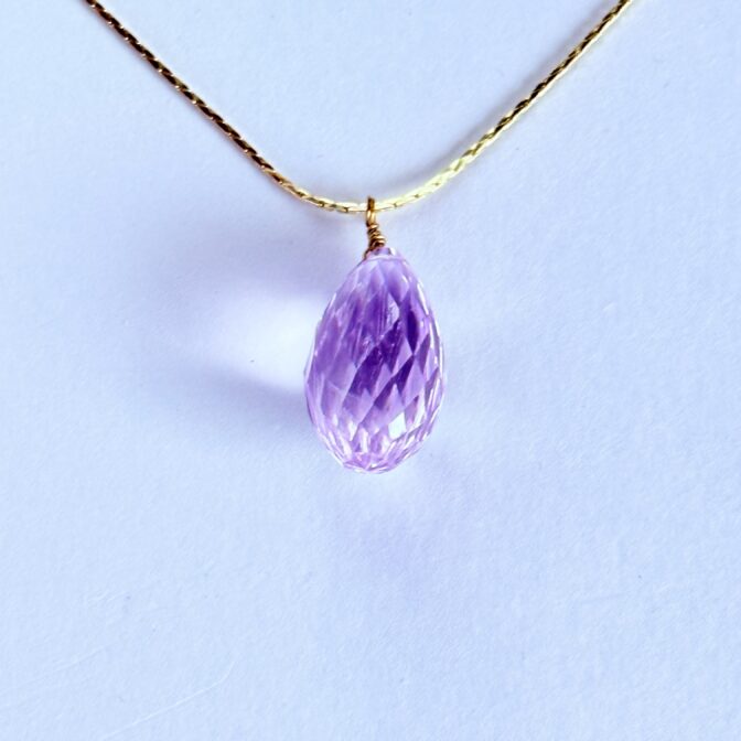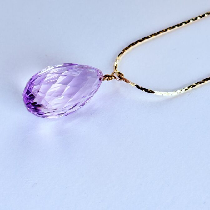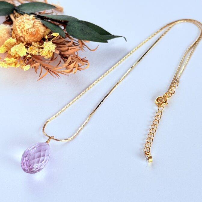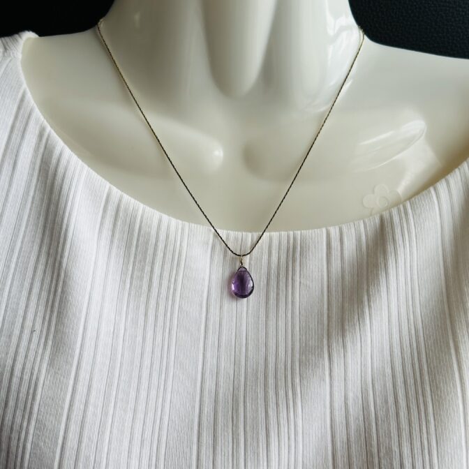 しずくのような美しいフォルムのアメジストが、胸元で気品あふれる輝きを放つネックレスです。