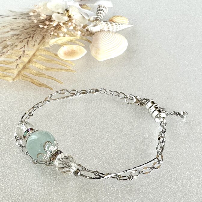 瑞々しい輝きを放つアクアマリンをクリスタルで優しく挟み、繊細な2連チェーンで仕立てたエレガントなブレスレットです。