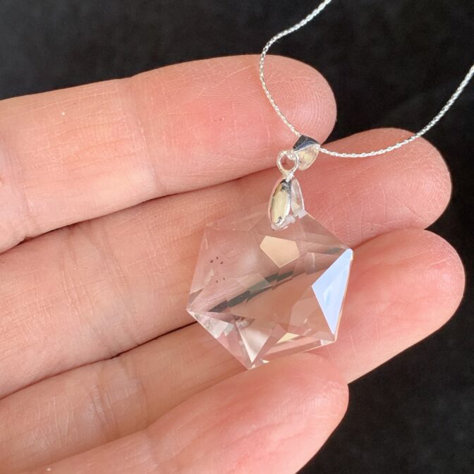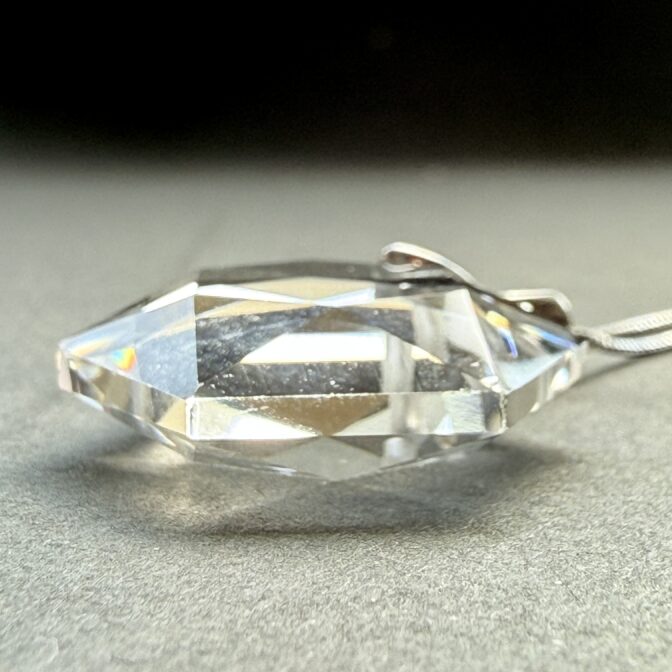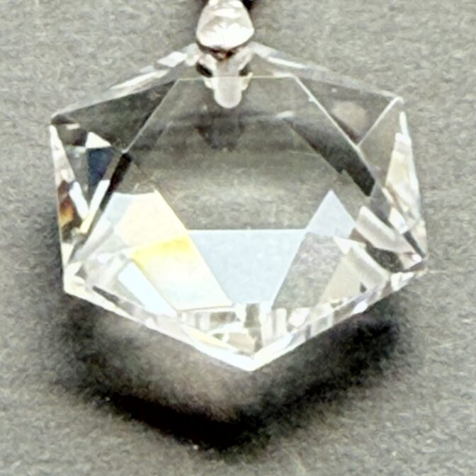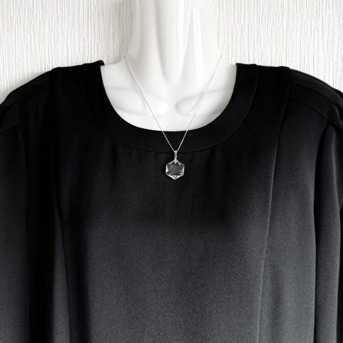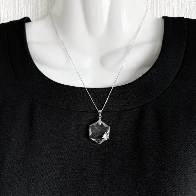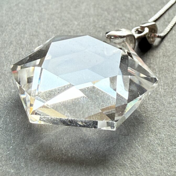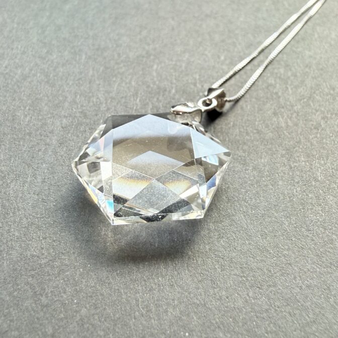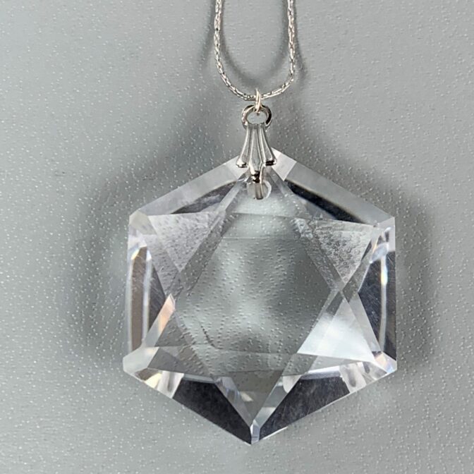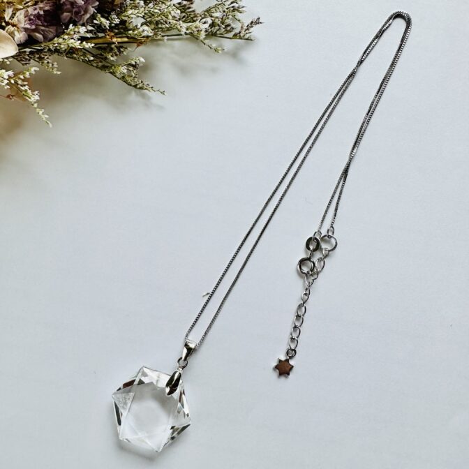 透明感あふれる六芒星のクリスタルが、静かに光を受けて神秘的な輝きを放つネックレスです。