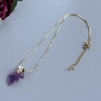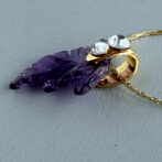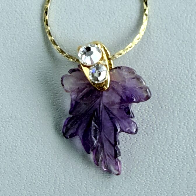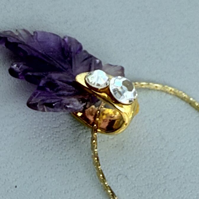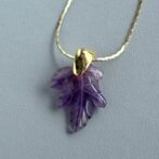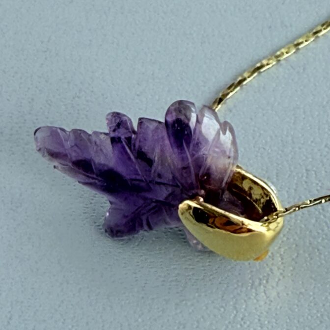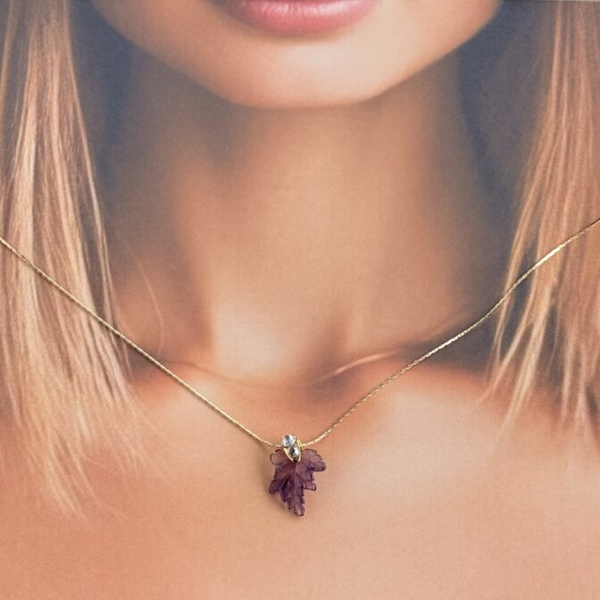 アメジストの優雅な紫が葉のように美しくカットされ、胸元に繊細な輝きを添えます。