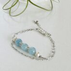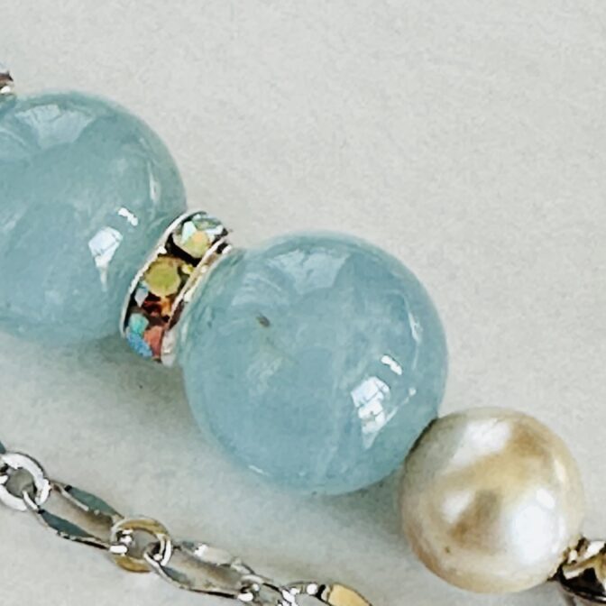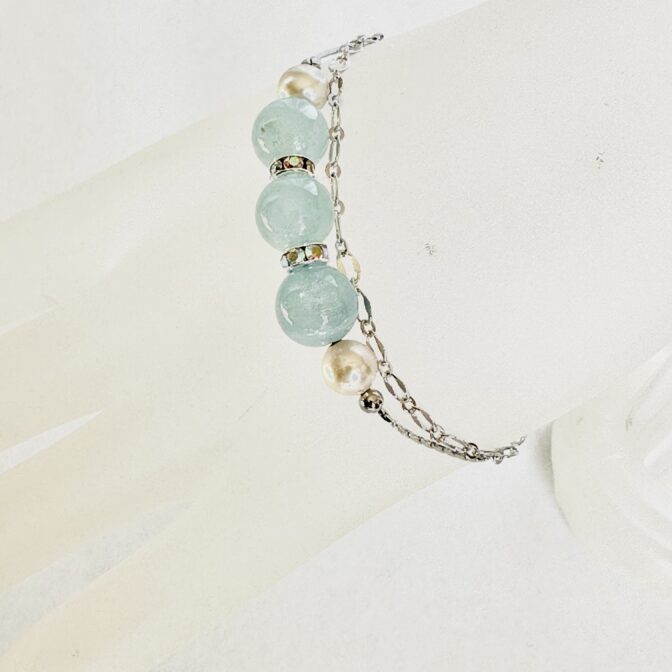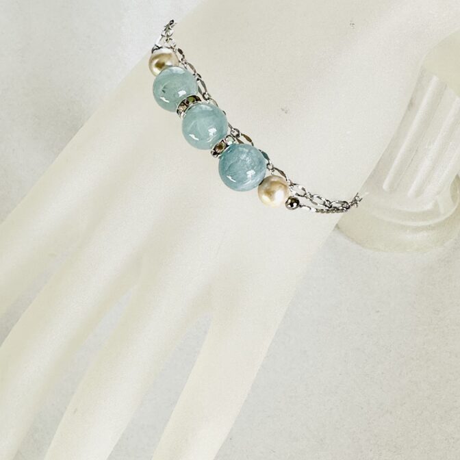 爽やかなアクアマリンの輝きとパールの柔らかな光沢が、装いに洗練されたアクセントを添えるブレスレットです。