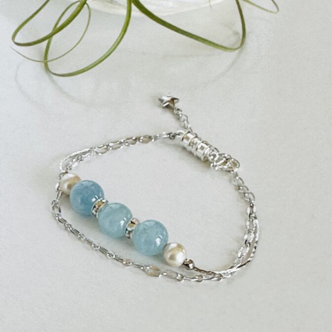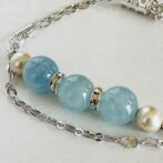 清らかな海を思わせるアクアマリンをあしらい、その輝きを引き立てるようにパールで優しく挟んだ2連ブレスレットです。