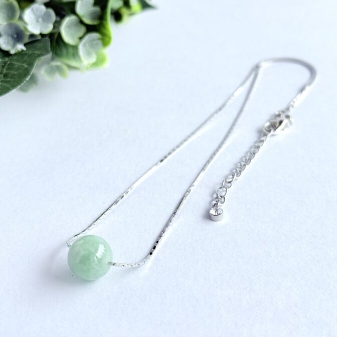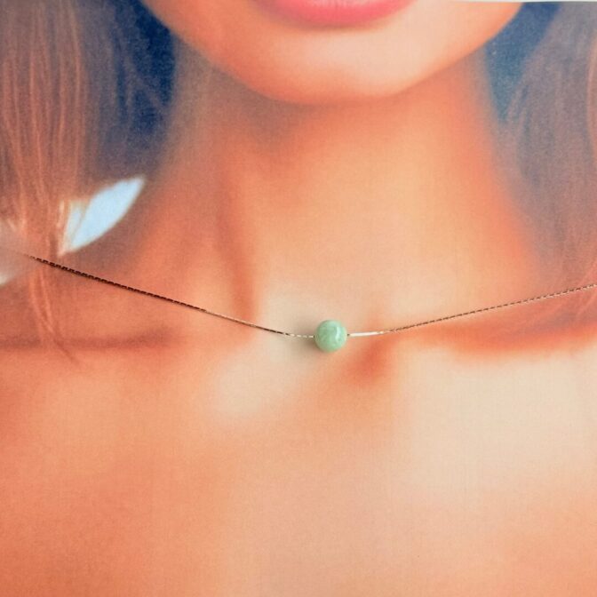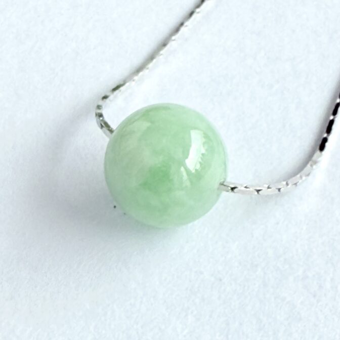 翡翠が胸元でさりげなく輝き、上品な存在感を演出します。