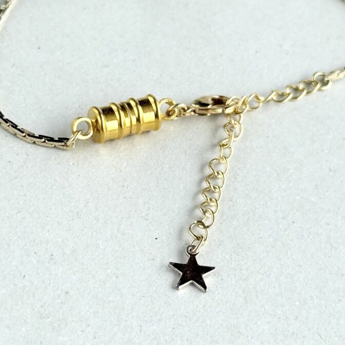 上品で深みのある翡翠を一粒あしらい、両サイドに可愛らしい星型のパーツを添えたエレガントなマグネット式ブレスレットです。
