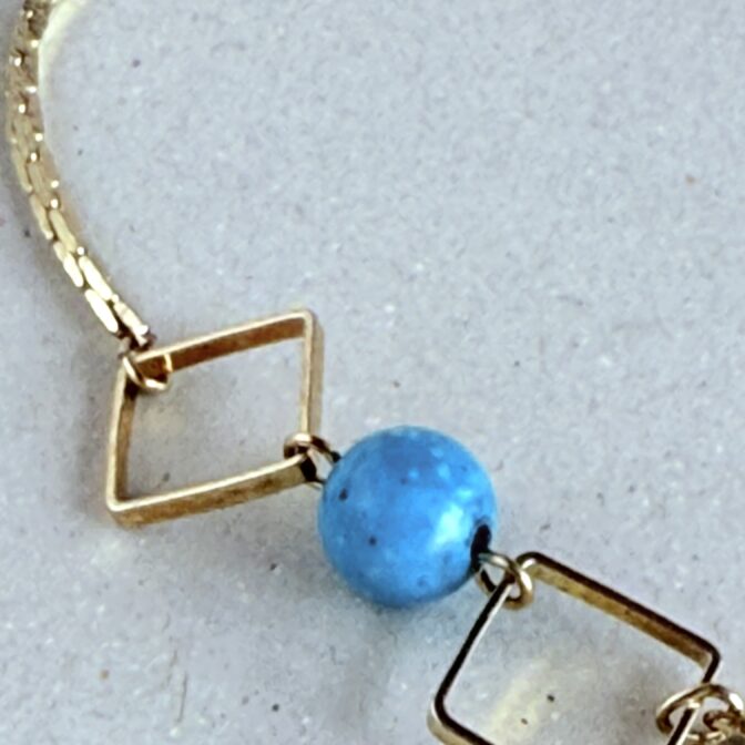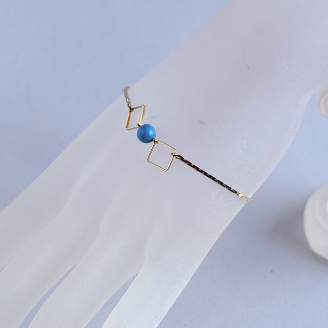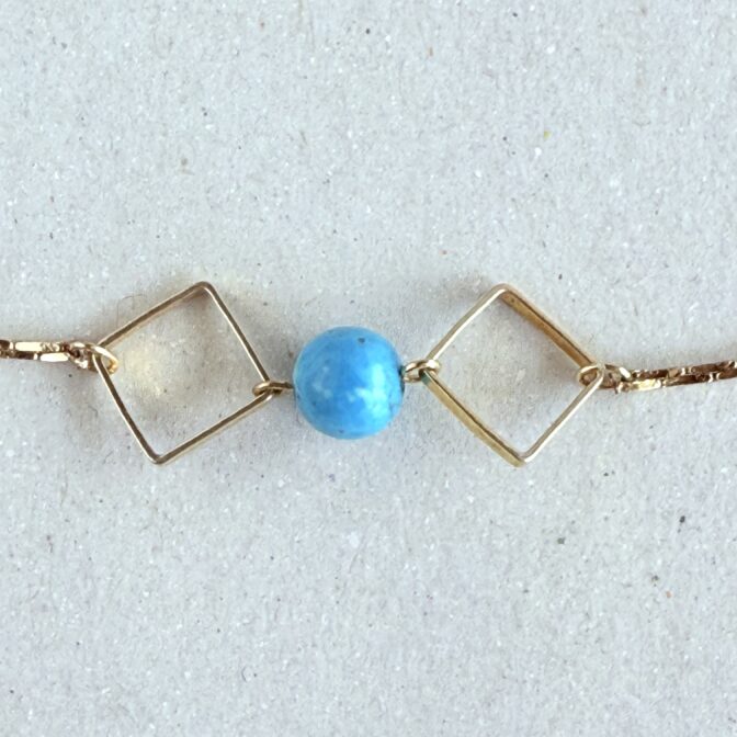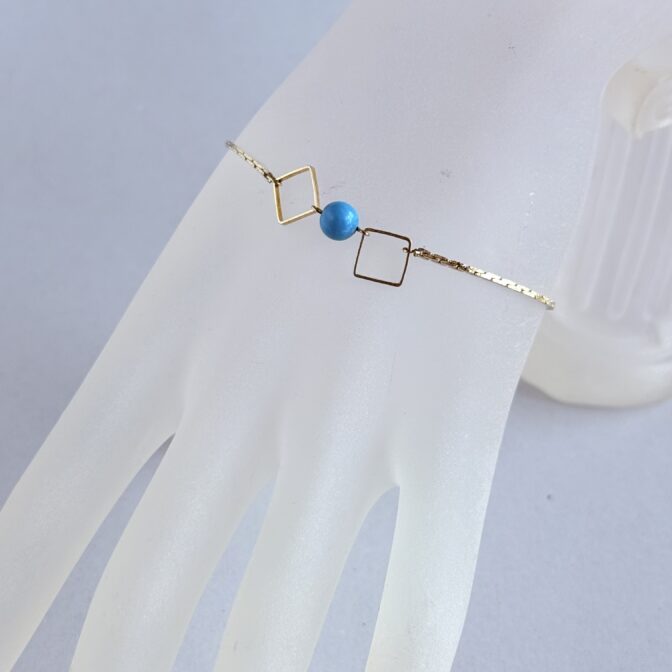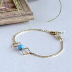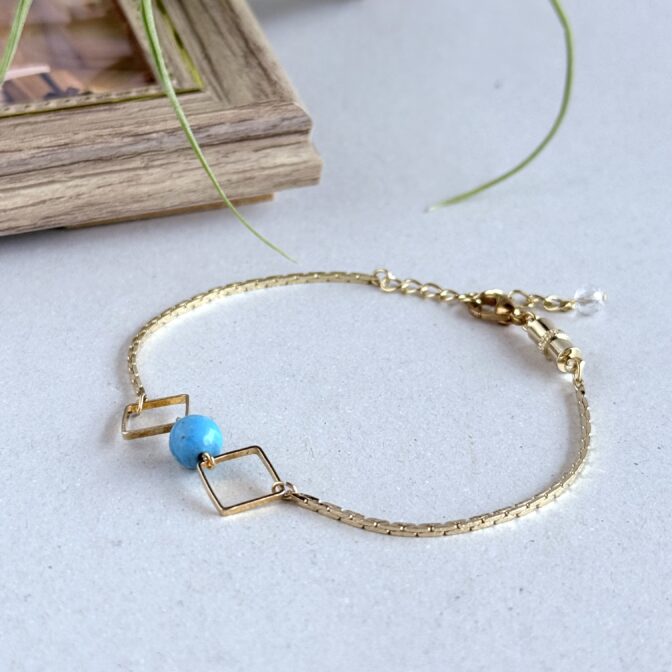 ゴールドのスクエアパーツと鮮やかなターコイズを組み合わせた、上品なブレスレットです。