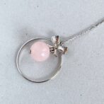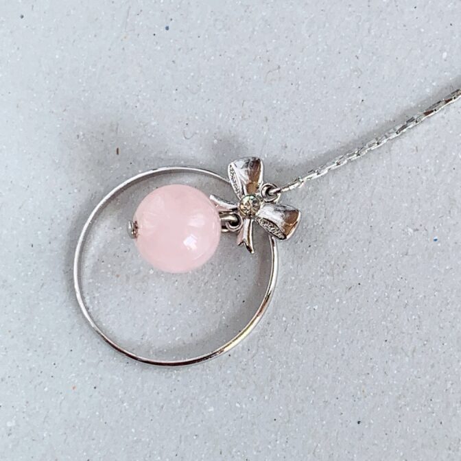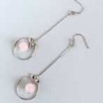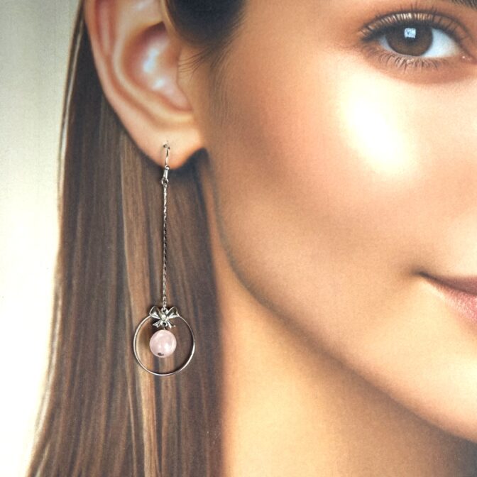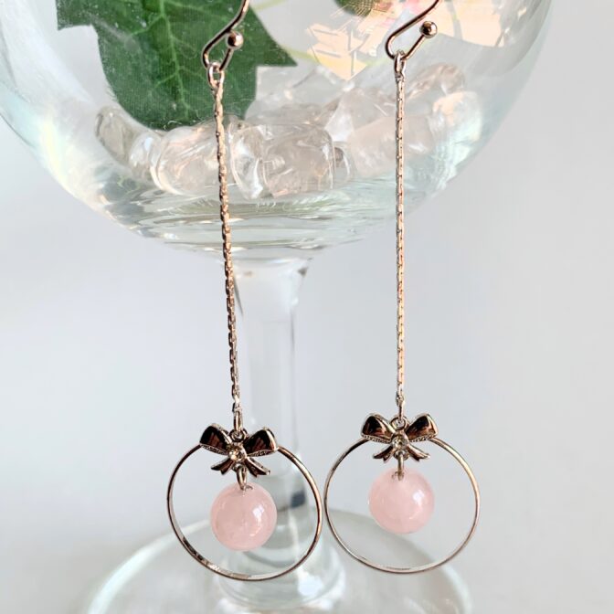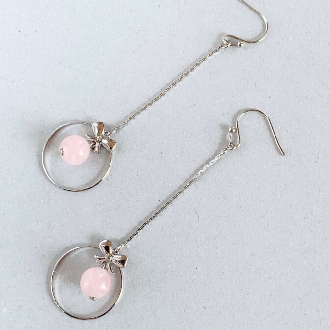 リボンモチーフのリングの中で、ローズクォーツが優雅に揺れるエレガントなピアスです。