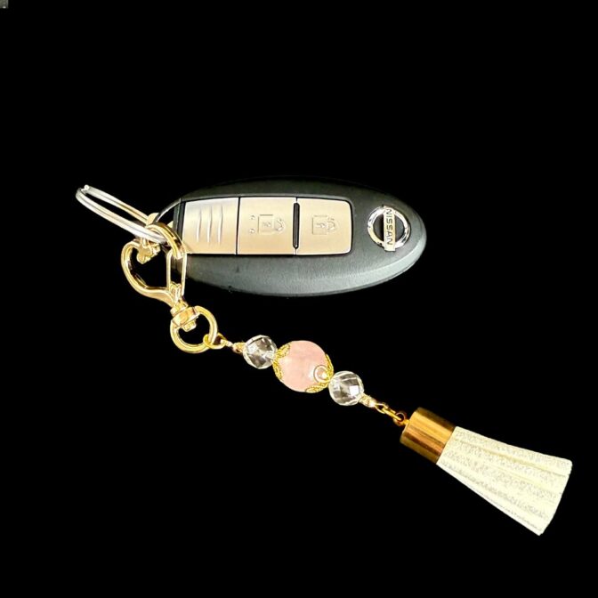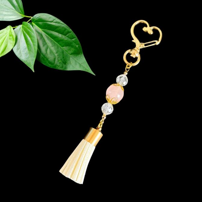 柔らかなピンク色のローズクォーツと、上品なタッセルが組み合わさり、バッグや鍵に華やかさをプラスします。