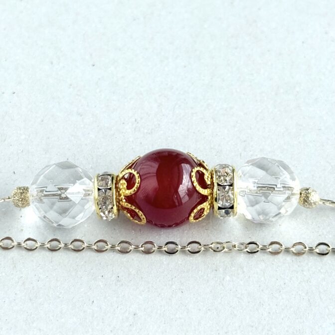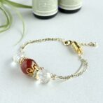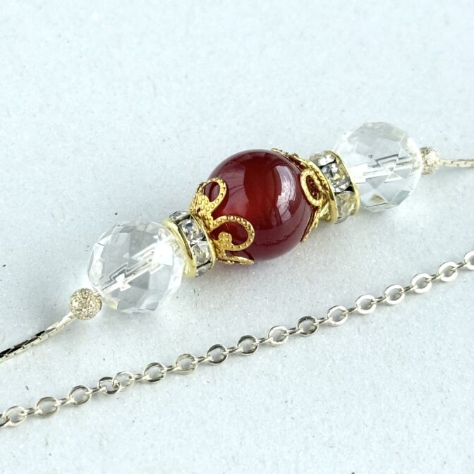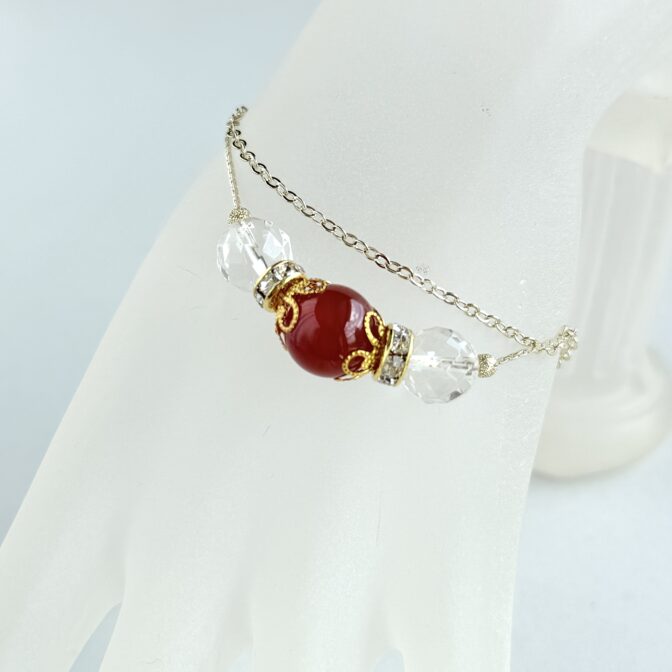 大粒のカーネリアンを優雅な多面カットのクリスタルで両端に挟んだエレガントな2連のブレスレットです。