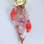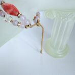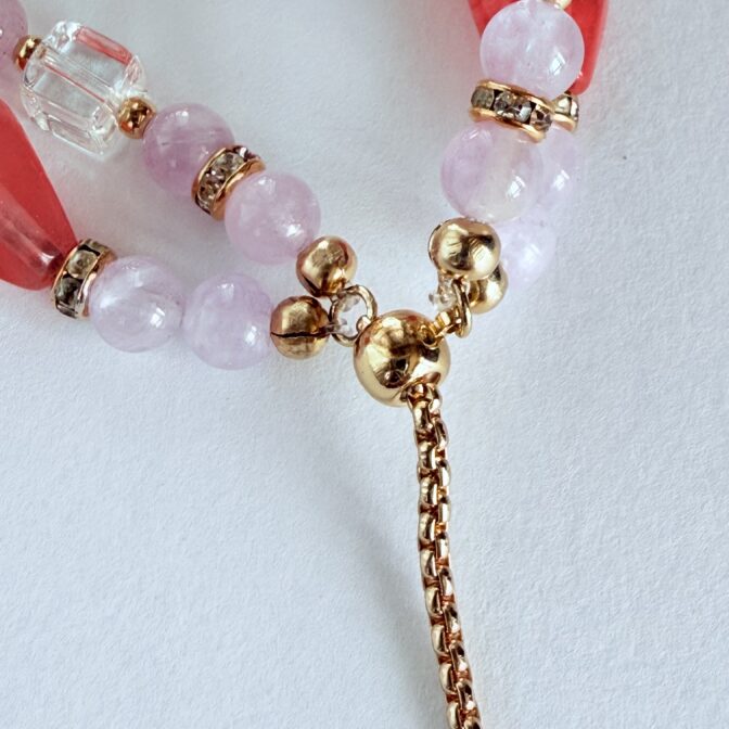 淡いピンクの天然石コーラルクォーツに、透明感のある水晶とアメジストを合わせ、女性らしい優しい印象に仕上げました。