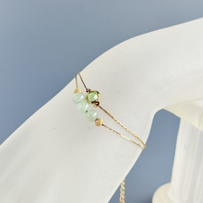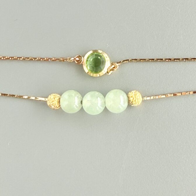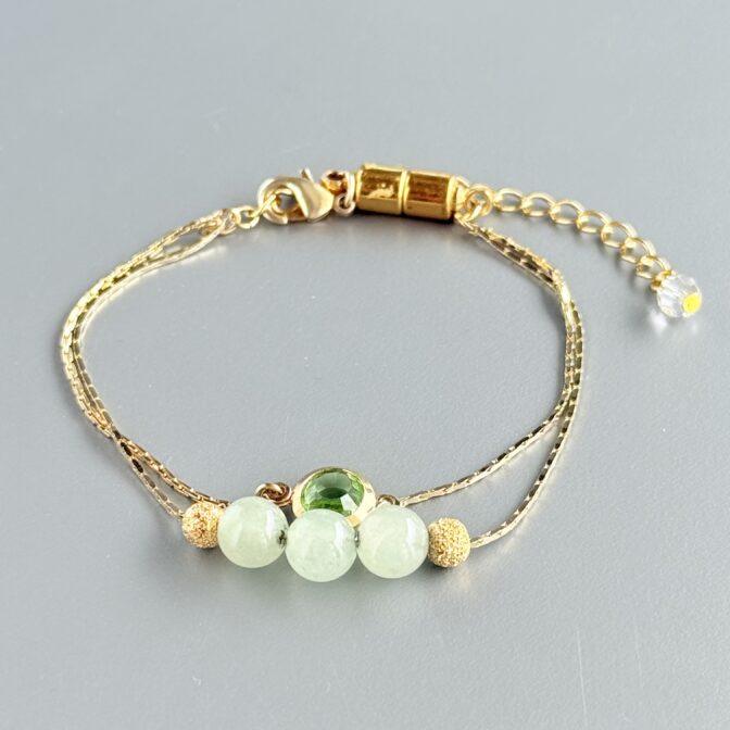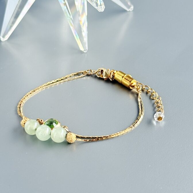 繊細なゴールドチェーンと、瑞々しいグリーンのアベンチュリンが優雅に輝く2連ブレスレットです。